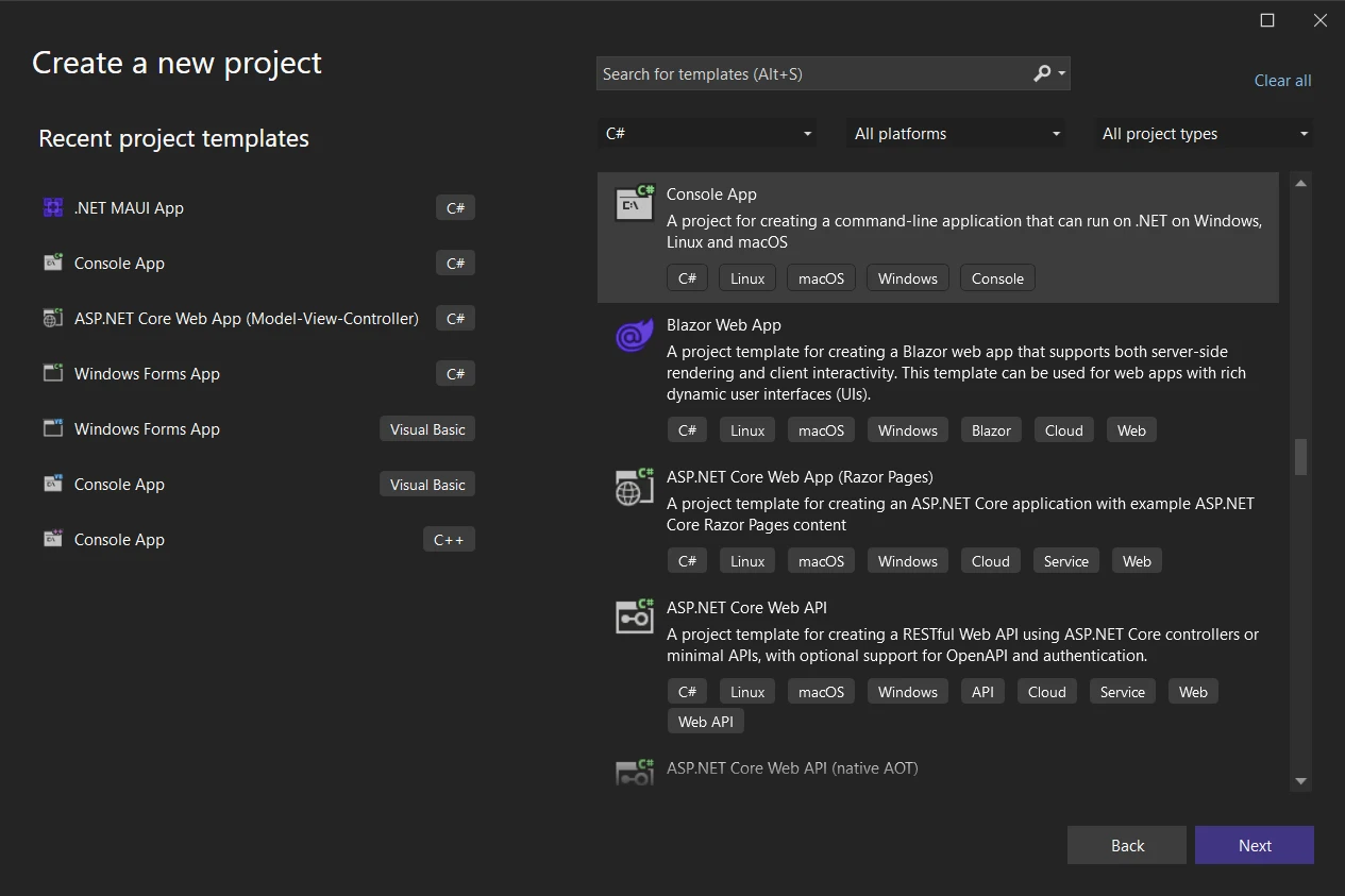 2.根據您的需求選擇適當的專案範本 (例如:主控台應用程式、Windows 表單應用程式)。