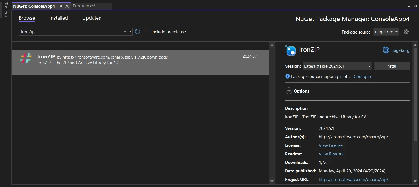 在 NuGet 套件管理器視窗中,搜尋"IronZip"。