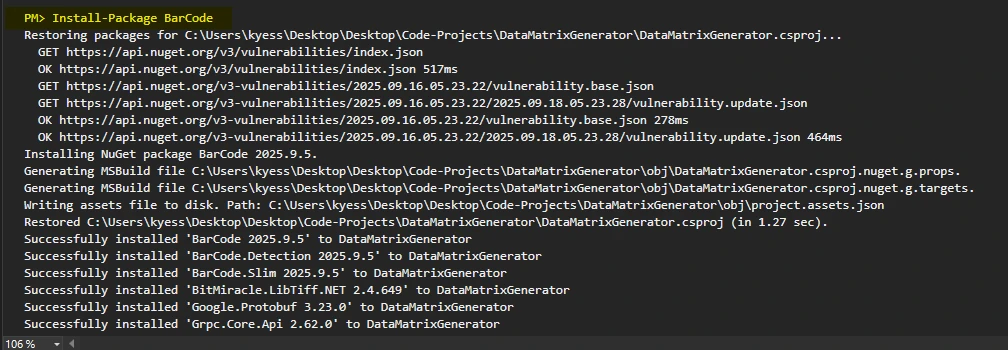 USING IRONBARCODE C# 中的数据矩阵生成器:IronBarcode 完整指南 Jordi Bardia 已发布:十二月 18, 2025 下载 IronBarcode NuGet 下载 DLL 下载 免费试用 法学硕士副本 法学硕士副本 将页面复制为 Markdown 格式,用于 LLMs 在 ChatGPT 中打开 向 ChatGPT 咨询此页面 在双子座打开 向 Gemini 询问此页面 在双子座打开 向 Gemini 询问此页面 打开困惑 向 Perplexity 询问有关此页面的信息 分享 在 Facebook 上分享 分享到 X(Twitter) 在 LinkedIn 上分享 复制链接 电子邮件文章 数据矩阵条形码是一种广泛使用的二维条码,它可以将大量的编码数据压缩到一个很小的区域内。 这使得它们非常适合用于药品标签、电子元件标记或库存管理中的物品跟踪,尤其是在空间有限的情况下。 在本教程中,您将学习如何使用IronBarcode在 C# 中生成 Data Matrix 条形码,为您的应用程序进行自定义,并将其导出为各种文件和格式。 立即开始使用 IronBarcode。 免费开始 Data Matrix条形码有何特别之处? 数据矩阵条形码是二维符号,它将数据编码到排列成行和列的黑白点阵网格中。 与传统的线性条形码(如 UPC 或 EAN)不同,它们可以在 10 x 10 个模块大小的空间内存储多达 2,335 个字母数字字符或 3,116 个数字。 由于内置的里德-所罗门纠错功能,即使符号损坏高达 30%,现代条形码阅读器和扫描器也能准确读取它们。 这些特性使得 Data Matrix 成为标记小型零件、邮政条形码和电子元件的理想选择,也适用于医疗保健和物流中心的标签制作。 医疗保健行业依赖GS1 数据矩阵标准进行药品追踪,而制造商则将其嵌入生产线,以帮助在全球范围内识别产品。由于单个条形码可以存储大量数据,因此它们现在已被国际上众多寻求完整应用可追溯性的行业广泛使用。 我该如何开始使用IronBarcode? 首先,通过 NuGet 包管理器安装 IronBarcode。 打开包管理器控制台并运行: Install-Package BarCode C# 数据矩阵生成器:IronBarcode 完整指南:图 1 - 与 C# 数据矩阵生成器:IronBarcode 完整指南相关的 5 张图片中的第 1 张 添加图片 alt 文本 或者在 NuGet 包管理器 UI 中搜索 Iron Software 的"BarCode"。 安装完成后,将命名空间添加到您的 C# 文件中: using IronBarCode; using IronBarCode; Imports IronBarCode $vbLabelText $csharpLabel 这就是所有设置所需的内容。 IronBarcode 按照ISO/IEC 16022 标准在内部处理所有复杂的 Data Matrix 编码,让您可以专注于您的应用程序逻辑。 有关详细的安装选项,请查看高级安装指南。 如何创建我的第一个Data Matrix条形码? 使用 IronBarcode 生成 Data Matrix 条形码只需要一行代码: // Create a Data Matrix barcode with product information var myBarcode = BarcodeWriter.CreateBarcode("PROD-12345-2024", BarcodeWriterEncoding.DataMatrix); // Save as high-quality PNG image myBarcode.SaveAsImage("product-label.png"); // Create a Data Matrix barcode with product information var myBarcode = BarcodeWriter.CreateBarcode("PROD-12345-2024", BarcodeWriterEncoding.DataMatrix); // Save as high-quality PNG image myBarcode.SaveAsImage("product-label.png"); IRON VB CONVERTER ERROR developers@ironsoftware.com $vbLabelText $csharpLabel 这段代码创建了一个数据矩阵条形码,编码文本"PROD-12345-2024",并将其保存为PNG图像。 BarcodeWriterEncoding.DataMatrix参数告诉 IronBarcode 专门使用 Data Matrix 格式。 生成的条形码自动采用 ECC200 标准。 这是现代数据矩阵规范,它包含内置纠错功能,可确保在实际条件下可靠扫描。 条形码输出 C# 数据矩阵生成器:IronBarcode 完整指南:图 2 - 第一个条形码输出 为了方便在应用程序中立即使用,您还可以将条形码检索为位图或将其导出为各种格式: // Get barcode as bitmap for direct display var barcodeBitmap = myBarcode.ToBitmap(); // Or save as PDF for document integration myBarcode.SaveAsPdf("barcode-document.pdf"); // Get barcode as bitmap for direct display var barcodeBitmap = myBarcode.ToBitmap(); // Or save as PDF for document integration myBarcode.SaveAsPdf("barcode-document.pdf"); IRON VB CONVERTER ERROR developers@ironsoftware.com $vbLabelText $csharpLabel 我可以编码哪些数据类型? Data Matrix 支持多种数据类型,这使得这款 C# 二维条形码生成器能够灵活应用于不同的应用场景: // Encode alphanumeric product codes var productCode = BarcodeWriter.CreateBarcode("ABC-123-XYZ", BarcodeWriterEncoding.DataMatrix); // Encode numeric serial numbers var serialNumber = BarcodeWriter.CreateBarcode("987654321098765", BarcodeWriterEncoding.DataMatrix); // Encode URLs for product information var urlCode = BarcodeWriter.CreateBarcode("https://example.com/product/12345", BarcodeWriterEncoding.DataMatrix); // Encode Unicode text for international applications var unicodeBarcode = BarcodeWriter.CreateBarcode("製品-2024-東京", BarcodeWriterEncoding.DataMatrix); unicodeBarcode.SaveAsImage("unicode-datamatrix.png"); // Encode alphanumeric product codes var productCode = BarcodeWriter.CreateBarcode("ABC-123-XYZ", BarcodeWriterEncoding.DataMatrix); // Encode numeric serial numbers var serialNumber = BarcodeWriter.CreateBarcode("987654321098765", BarcodeWriterEncoding.DataMatrix); // Encode URLs for product information var urlCode = BarcodeWriter.CreateBarcode("https://example.com/product/12345", BarcodeWriterEncoding.DataMatrix); // Encode Unicode text for international applications var unicodeBarcode = BarcodeWriter.CreateBarcode("製品-2024-東京", BarcodeWriterEncoding.DataMatrix); unicodeBarcode.SaveAsImage("unicode-datamatrix.png"); IRON VB CONVERTER ERROR developers@ironsoftware.com $vbLabelText $csharpLabel 每种编码类型都会根据您的数据自动优化。 数字数据比字母数字文本占用空间更少,而二进制
