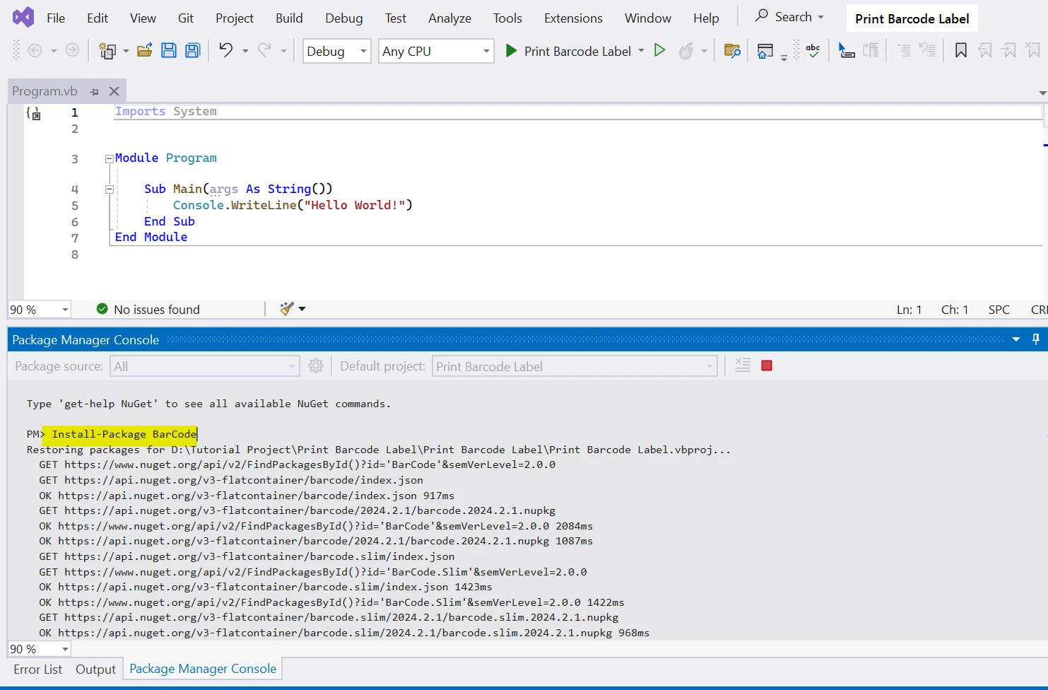 USING IRONBARCODE How to Print A Barcode Label in VB .NET Jordi Bardia 已更新:七月 28, 2025 下载 IronBarcode NuGet 下载 DLL 下载 免费试用 法学硕士副本 法学硕士副本 将页面复制为 Markdown 格式,用于 LLMs 在 ChatGPT 中打开 向 ChatGPT 咨询此页面 在双子座打开 向 Gemini 询问此页面 在双子座打开 向 Gemini 询问此页面 打开困惑 向 Perplexity 询问有关此页面的信息 分享 在 Facebook 上分享 分享到 X(Twitter) 在 LinkedIn 上分享 复制链接 电子邮件文章 条形码标签在库存管理、产品跟踪和供应链运营中至关重要。 本文将介绍如何使用IronBarcode在VB.NET中进行条形码打印。 无论您是经验丰富的开发人员还是刚刚入门的新手,我们都将探索高效创建和打印条形码标签的方法。 从设计标签模板到处理打印机设置,我们的循序渐进的方法将帮助您为您的业务需求生成准确且美观的标签。 如何在VB.NET中打印条形码标签 在 Visual Studio 中创建或打开一个项目 生成条形码 调整条形码大小 添加条形码值和注释文本 设计条形码样式 条形码标签为何重要 在深入探讨技术细节之前,让我们先了解一下条形码标签为何重要: 1.高效的数据表示:条形码编码了产品 ID、批号、有效期和价格等重要信息。 扫描后,它们可以立即提供相关数据,从而简化各个行业的流程。 2.减少错误:手动数据录入容易出错。 条形码标签消除了人为错误的风险,确保在库存管理、销售交易和运输过程中准确采集数据。 3.供应链优化:条形码有助于在整个供应链中无缝跟踪货物。 从生产商到零售商,每个人都能从标准化标签中受益。 为什么选择VB.NET和IronBarcode? VB.NET 是一种功能强大且用途广泛的编程语言,非常适合自动化标签打印等任务。 但是,它没有内置的条形码生成功能。 这时 IronBarcode 就派上用场了,它是一个提供所有条形码相关功能的库。 将其集成到您的项目中,即可开始利用条形码的强大功能! IronBarcode IronBarcode是一个功能强大的 .NET 库,可简化条形码的生成和操作。 无论您是构建库存管理系统、零售应用程序还是供应链解决方案,IronBarcode 都能提供创建、读取和 打印条形码的无缝方式。 IronBarcode 支持各种条形码符号(例如 Code 39、QR 码和 UPC),提供可自定义的设置,并可轻松集成到您的 VB.NET 或 C# 项目中,使开发人员能够高效地处理与条形码相关的任务。 其直观的 API 可让您生成准确且美观的条形码标签,从而提高数据准确性并简化业务流程。 生成和打印条形码 我们将使用 VB.NET 项目编写代码来生成和打印条形码。 首先,您需要创建或打开一个 VB.NET 项目,然后安装 IronBarcode 库。 本示例将使用控制台应用程序; 但是,您可以根据自己的需要使用任何项目类型,因为此代码适用于所有项目类型。 安装 IronBarcode 库 要通过包管理器控制台将 IronBarcode 库无缝集成到您的项目中,请按照以下步骤操作,以确保顺利完成安装: 打开你的 Visual Studio 项目。 点击菜单中的"工具"。 选择 NuGet 包管理器。 选择软件包管理器控制台。 在控制台中,输入以下命令并按 Enter 键: Install-Package Barcode Install-Package Barcode SHELL 此命令将为您下载并安装 IronBarcode 软件包。 如何在 VB.NET 中打印条形码标签:图 1 - 控制台消息记录 IronBarcode 安装过程 IronBarcode 可免费用于开发目的,但要探索其所有功能则需要许可证。 生成条形码图像 编写以下代码以生成条形码。 Imports IronBarCode Module Program Sub Main(args As String()) ' Creating a barcode is simple: Dim myBarcode = BarcodeWriter.CreateBarcode("123456BCX65432", BarcodeWriterEncoding.Code128) ' Save the barcode as an image: myBarcode.SaveAsImage("myBarcode.jpeg") End Sub End Module Imports IronBarCode Module Program Sub Main(args As String()) ' Creating a barcode is simple: Dim myBarcode = BarcodeWriter.CreateBarcode("123456BCX65432", BarcodeWriterEncoding.Code128) ' Save the barcode as an image: myBarcode.SaveAsImage("myBarcode.jpeg") End Sub End Module VB .NET 这段代码简化了使用 IronBarcode 库生成条形码图像的过程。 它展示了如何创建条形码并将其保存为图像,本质上是将数据转换为可扫描的图片。 -导入 IronBarCode:此行允许我们的程序使用 IronBarcode 库提供的功能。 -创建条形码:使用 Code 128 编码为值"123456BCX65432"生成条形码。 条形码是由线条和空格组成的独特图案,代表特定的信息。 -保存图像:将条形码保存为名为"myBarcode.jpeg"的图像文件。 该文件包含条形码的视觉表示,可以打印或显示。 输出 如何在 VB.NET 中打印条形码标签:图 2 - 上一个代码示例中输出的条形码 让我们调整条形码的大小,使其适合打印区域。 调整条形码图像大小 以下代码将根据提供的尺寸调整条形码的大小。 Sub Main(args As String()) ' Creating a barcode is simple: Dim myBarcode = BarcodeWriter.CreateBarcode("123456BCX65432", BarcodeWriterEncoding.Code128) ' Resize the Barcode: myBarcode.ResizeTo(400, 100) ' Save our barcode as an image: myBarcode.SaveAsImage("myBarcode.jpeg") End Sub Sub Main(args As String()) ' Creating a barcode is simple: Dim myBarcode = BarcodeWriter.CreateBarcode("123456BCX65432", BarcodeWriterEncoding.Code128) ' Resize the Barcode: myBarcode.ResizeTo(400, 100) ' Save our barcode as an image: myBarcode.SaveAsImage("myBarcode.jpeg") End Sub VB .NET 条形码的生成过程保持不变。 我们刚刚添加了一行代码,用于在保存之前调整图像大小。 这样就将其尺寸调整为宽 400 像素、高 100 像素,确保在显示或打印时能够很好地适应所需的空间。 输出 如何