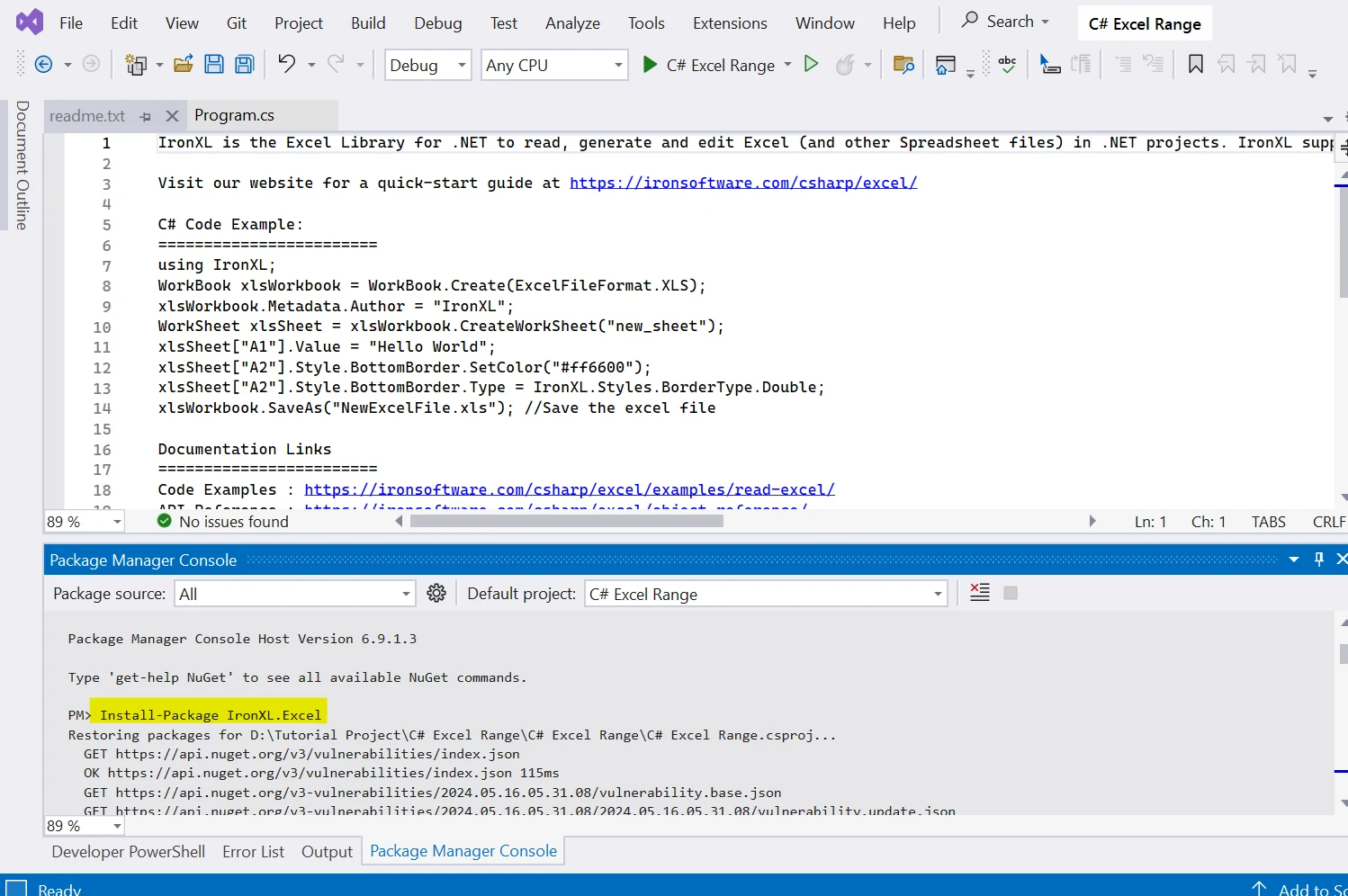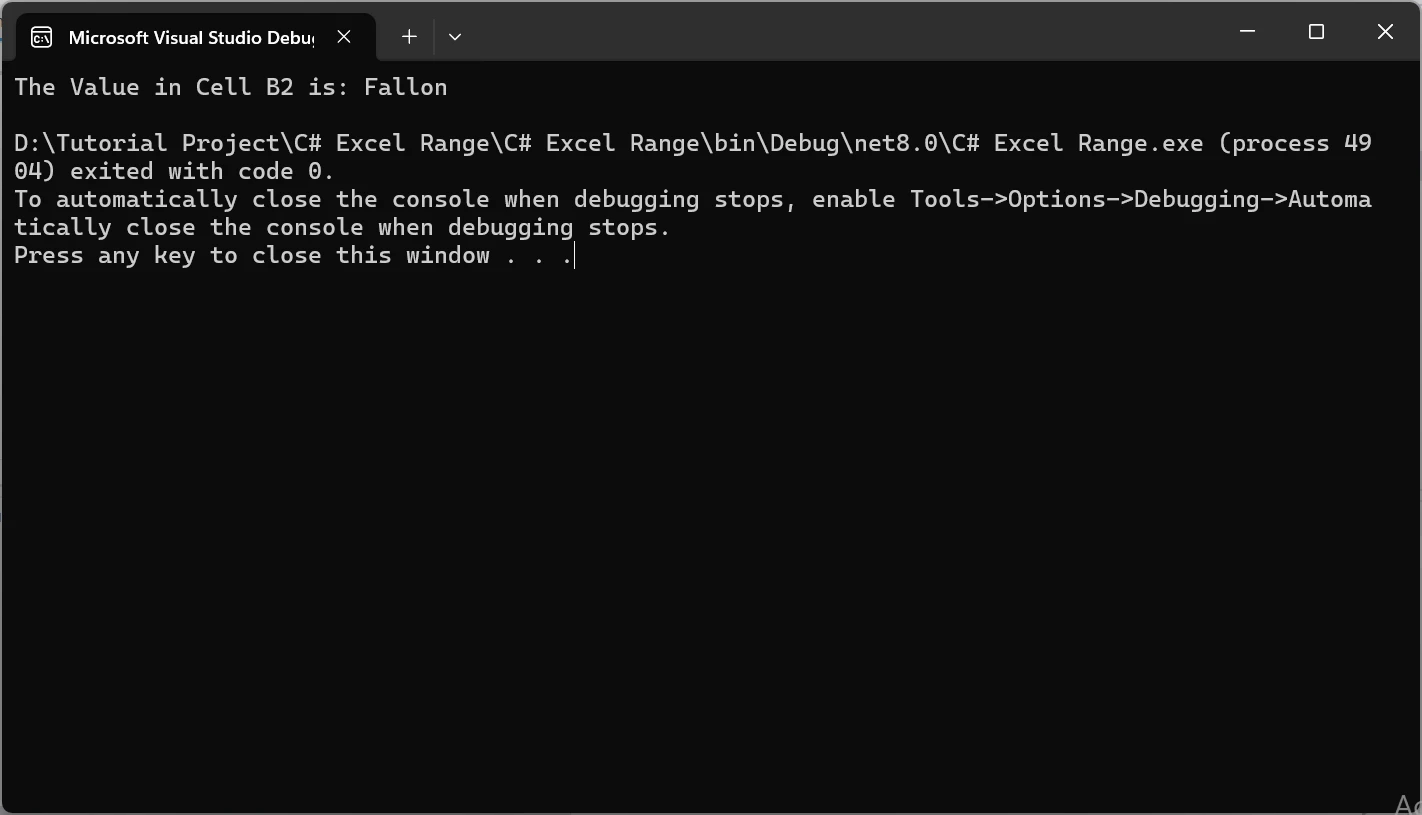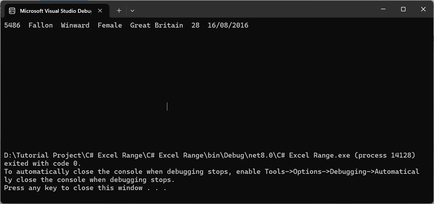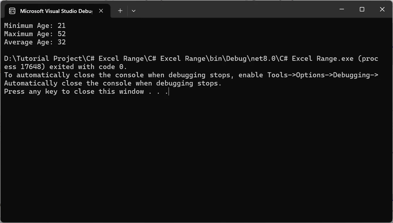 使用 IRONXL 如何在 C# 中管理 Excel 范围 Curtis Chau 已更新:七月 28, 2025 下载 IronXL NuGet 下载 DLL 下载 免费试用 法学硕士副本 法学硕士副本 将页面复制为 Markdown 格式,用于 LLMs 在 ChatGPT 中打开 向 ChatGPT 咨询此页面 在双子座打开 向 Gemini 询问此页面 在双子座打开 向 Gemini 询问此页面 打开困惑 向 Perplexity 询问有关此页面的信息 分享 在 Facebook 上分享 分享到 X(Twitter) 在 LinkedIn 上分享 复制链接 电子邮件文章 通过编程方式处理Excel 文件可以显著提高 C# 应用程序的效率和自动化功能。 无论您是生成报告、处理数据还是动态创建复杂的电子表格,掌握 Excel 文件的操作都至关重要。 在本教程中,我们将重点介绍如何使用IronXL处理 Excel 区域。 我们将介绍如何在 Excel 文件中写入、读取和操作区域。 如何在 C# 中读取 Excel 区域 安装 IronXL 库以处理 Excel 文件。 加载工作簿并指定工作表。 选择要读取的单元格范围。 从指定范围内提取和读取数据。 什么是 IronXL? IronXL是一个全面的 C# 库,它简化了 Excel 文件的操作,提供了一系列功能,可实现电子表格数据的无缝集成和操作。 它具备读取、写入和修改Excel 文件的功能,无需安装 Microsoft Excel,从而实现跨平台兼容性。 IronXL 可以方便地从特定单元格、区域或整个工作表中提取数据,并提供格式设置、样式设置和条件格式设置等高级功能。 IronXL 支持计算、公式和统计分析,使开发人员能够以编程方式高效地处理 Excel 操作,使其成为在 C# 应用程序中自动化以数据为中心的任务的不可或缺的工具。 C# 中 Excel 单元格区域的入门 首先,我们需要在应用程序中安装 IronXL 库。 安装 IronXL NuGet 包 您可以使用以下命令通过 NuGet 包管理器安装 IronXL: Install-Package IronXL.Excel 上述命令将安装 IronXL 及其所有依赖项。 如何在 C# 中管理 Excel 区域:图 1 添加命名空间 在 Program.cs 类的顶部,或任何你想使用 IronXL 方法的地方,添加以下命名空间。 using IronXL; using IronXL; Imports IronXL $vbLabelText $csharpLabel 加载 Excel 工作簿 第一步是加载 Excel 工作簿。 以下代码会将 Excel 工作簿加载到我们的应用程序中。 static void Main(string[] args) { // Load an existing Excel workbook var workbook = WorkBook.Load("test_excel.xlsx"); // Retrieve the specified worksheet from the workbook var sheet = workbook.GetWorkSheet("Sheet1"); } static void Main(string[] args) { // Load an existing Excel workbook var workbook = WorkBook.Load("test_excel.xlsx"); // Retrieve the specified worksheet from the workbook var sheet = workbook.GetWorkSheet("Sheet1"); } Shared Sub Main(ByVal args() As String) ' Load an existing Excel workbook Dim workbook = WorkBook.Load("test_excel.xlsx") ' Retrieve the specified worksheet from the workbook Dim sheet = workbook.GetWorkSheet("Sheet1") End Sub $vbLabelText $csharpLabel 第一行代码从名为"test_excel.xlsx"的文件中加载一个现有的Excel工作簿。 第二行从已加载的工作簿中检索名为"Sheet1"的工作表。 在本教程中,我将使用以下 Excel 文件。 如何在 C# 中管理 Excel 区域:图 2 从一系列数据中读取数据 现在,让我们读取指定单元格范围内的数据。 // Define a range from cell A2 to G10 in the worksheet var range = sheet["A2:G10"]; // Iterate over each cell in the range and output its value foreach (var item in range) { Console.WriteLine(item); } // Define a range from cell A2 to G10 in the worksheet var range = sheet["A2:G10"]; // Iterate over each cell in the range and output its value foreach (var item in range) { Console.WriteLine(item); } ' Define a range from cell A2 to G10 in the worksheet Dim range = sheet("A2:G10") ' Iterate over each cell in the range and output its value For Each item In range Console.WriteLine(item) Next item $vbLabelText $csharpLabel 第一行选择工作表中的特定范围地址(A2 到 G10),允许您同时处理多个 Excel 单元格。 foreach (var item in range)循环遍历此单元格范围内的每个单元格,从而实现高效的数据处理。 通过使用 Console.WriteLine(item);,代码将每个单元格的值打印到控制台,使得审查范围内的内容变得简单。 这种方法简化了数据处理,提高了代码可读性。 在区域中使用 Excel 公式 让我们选择一个特定的范围,并应用一些 Excel 公式。 // Define a range from cell F2 to F42 for statistical analysis var range = sheet["F2:F42"]; // Output the minimum age within the range Console.WriteLine($"Minimum Age: {range.Min()}"); // Output the maximum age within the range Console.WriteLine($"Maximum Age: {range.Max()}"); // Output the average age, casting the average value to an integer Console.WriteLine($"Average Age: {(int)range.Avg()}"); // Define a range from cell F2 to F42 for statistical analysis var range = sheet["F2:F42"]; // Output the minimum age within the range Console.WriteLine($"Minimum Age: {range.Min()}"); // Output the maximum age within the range Console.WriteLine($"Maximum Age: {range.Max()}"); // Output the average age, casting the average value to an integer Console.WriteLine($"Average Age: {(int)range.Avg()}"); Imports System ' Define a range from cell F2 to F42 for statistical analysis Dim range = sheet("F2:F42") ' Output the minimum age within the range Console.WriteLine($"Minimum Age: {range.Min()}") ' Output the maximum age within the range Console.WriteLine($"Maximum Age: {range.Max()}") ' Output the average age, casting the average value to an integer Console.WriteLine($"Average Age: {CInt(Math.Truncate(range.Avg()))}") $vbLabelText $csharpLabel 代码var range = sheet["F2:F42"];选择从 F2 到 F42 的单元格区域,以便对年龄数据进行统计分析。 使用range.Min()和range.Max() ,可以高效地计算指