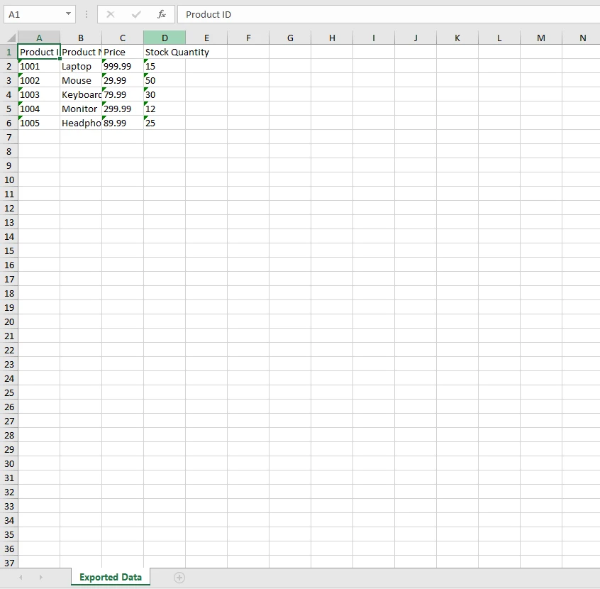 使用 IRONXL 如何在C#中将DataGridView导出到包含列头的Excel Curtis Chau 已发布:十月 27, 2025 下载 IronXL NuGet 下载 DLL 下载 免费试用 法学硕士副本 法学硕士副本 将页面复制为 Markdown 格式,用于 LLMs 在 ChatGPT 中打开 向 ChatGPT 咨询此页面 在双子座打开 向 Gemini 询问此页面 在双子座打开 向 Gemini 询问此页面 打开困惑 向 Perplexity 询问有关此页面的信息 分享 在 Facebook 上分享 分享到 X(Twitter) 在 LinkedIn 上分享 复制链接 电子邮件文章 立即开始使用 IronXL。 免费开始 将 Windows Forms DataGridView 控件中的数据导出为 Excel 格式是常见的需求,但开发人员经常会遇到一个关键问题:导出的文件中缺少列标题。当您需要将 DataGridView 数据导出到 Excel 并保留列标题时,您需要一个能够完美保留所有数据和格式的解决方案。 虽然使用 Microsoft Office Interop 的传统方法速度较慢且需要安装 MS Excel,但IronXL提供了一个简化的解决方案,可以无缝地处理数据网格视图到 Excel 的转换。 在这篇文章中,我们将向您展示如何使用 IronXL(一个功能强大的.NET Excel 库,无需 Microsoft Office 依赖即可运行)将 DataGridView 数据导出到 Excel,并保留所有数据和列标题。 您将学习如何用几行代码实现一个完整的导出解决方案,该方案可以处理标头、数据类型和用户友好的文件保存。 我们还会提及一些常见的陷阱,演示对象 obj 的使用示例,并提供一些评论和注释,以便您可以进一步扩展示例。 IronXL为何是理想之选? IronXL 通过提供无需安装 Microsoft Excel 的直观 API,简化了 .NET 应用程序中的 Excel 操作。 与基于互操作性的解决方案不同,IronXL 可以独立运行,因此非常适合服务器环境和没有 Office 的机器。 该库可处理所有Excel 格式,包括 XLSX、XLS 和 CSV,并在整个导出过程中保持数据完整性和格式。 开发人员无需安装 Excel 即可轻松复制数据、扩展工作表以及删除或添加行。 设置 Windows 窗体项目 首先,在 Visual Studio 中创建一个新的 Windows 窗体应用程序。 项目准备就绪后,通过 NuGet 包管理器安装 IronXL。 打开软件包管理器控制台并运行: Install-Package IronXL.Excel 安装完成后,请将以下必要的命名空间添加到您的表单中: using IronXL; using System; using System.Data; using System.Windows.Forms; using IronXL; using System; using System.Data; using System.Windows.Forms; IRON VB CONVERTER ERROR developers@ironsoftware.com $vbLabelText $csharpLabel 这些导入功能提供了对IronXL 的 Excel 功能、数据表操作和 Windows 窗体控件的访问,这些功能是导出过程所必需的。 使用示例数据创建 DataGridView 让我们构建一个简单的界面,其中包含一个填充了示例数据源的 DataGridView。 您可能还需要从 CSV 文件或数据库导入数据,下面的 DataTable 方法同样适用于导入的数据集。 通过 Visual Studio 设计器向窗体添加一个新的 DataGridView 和一个按钮,然后使用以下代码设置数据: private void Form1_Load(object sender, EventArgs e) { // Example object usage object obj = "Initializing DataTable"; Console.WriteLine(obj); // Create a DataTable with sample data DataTable dt = new DataTable(); // Add columns with descriptive headers dt.Columns.Add("Product ID", typeof(int)); dt.Columns.Add("Product Name", typeof(string)); dt.Columns.Add("Price", typeof(decimal)); dt.Columns.Add("Stock Quantity", typeof(int)); // Add sample rows dt.Rows.Add(1001, "Laptop", 999.99m, 15); dt.Rows.Add(1002, "Mouse", 29.99m, 50); dt.Rows.Add(1003, "Keyboard", 79.99m, 30); dt.Rows.Add(1004, "Monitor", 299.99m, 12); dt.Rows.Add(1005, "Headphones", 89.99m, 25); // Bind the DataTable to DataGridView Control dataGridView1.DataSource = dt; } private void Form1_Load(object sender, EventArgs e) { // Example object usage object obj = "Initializing DataTable"; Console.WriteLine(obj); // Create a DataTable with sample data DataTable dt = new DataTable(); // Add columns with descriptive headers dt.Columns.Add("Product ID", typeof(int)); dt.Columns.Add("Product Name", typeof(string)); dt.Columns.Add("Price", typeof(decimal)); dt.Columns.Add("Stock Quantity", typeof(int)); // Add sample rows dt.Rows.Add(1001, "Laptop", 999.99m, 15); dt.Rows.Add(1002, "Mouse", 29.99m, 50); dt.Rows.Add(1003, "Keyboard", 79.99m, 30); dt.Rows.Add(1004, "Monitor", 299.99m, 12); dt.Rows.Add(1005, "Headphones", 89.99m, 25); // Bind the DataTable to DataGridView Control dataGridView1.DataSource = dt; } IRON VB CONVERTER ERROR developers@ironsoftware.com $vbLabelText $csharpLabel 此示例创建一个数据表并将其绑定到网格。 即使数据量较小,该方法也能很好地扩展到更大的表格。 这里定义的列名将成为 Excel 文件中的标题。 示例数据代表了一个简单的产品库存,便于验证导出是否正确。 对于更复杂的数据绑定场景,微软关于DataGridView 数据绑定的文档提供了更多示例。 这将创建一个 DataGridView,其中填充了我们代码中的所有数据: 如何在 C# 中将带有列标题的 DataGridView 导出到 Excel:图 1 - DataGridView 中的示例数据 实现带列标题的导出 现在来说说主要功能,即在保留列标题的情况下将 DataGridView 导出到 Excel。 添加此方法来处理导出按钮的点击事件: private void btnExport_Click(object sender, EventArgs e) { // Create a new Excel workbook WorkBook workbook = WorkBook.Create(ExcelFileFormat.XLSX); WorkSheet worksheet = workbook.CreateWorkSheet("Exported Data"); // Export column headers for (int col = 0; col < dataGridView1.Columns.Count; col++) { worksheet.SetCellValue(0, col, dataGridView1.Columns[col].HeaderText); } // Export data rows for (int row = 0; row < dataGridView1.Rows.Count; row++) { // Skip the last empty row (used for adding 