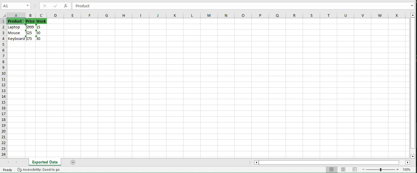 使用 IRONXL C# 使用 IronXL.Excel 将 HTML 表格导出为 Excel 文件 Curtis Chau 已发布:十二月 18, 2025 下载 IronXL NuGet 下载 DLL 下载 免费试用 法学硕士副本 法学硕士副本 将页面复制为 Markdown 格式,用于 LLMs 在 ChatGPT 中打开 向 ChatGPT 咨询此页面 在双子座打开 向 Gemini 询问此页面 在双子座打开 向 Gemini 询问此页面 打开困惑 向 Perplexity 询问有关此页面的信息 分享 在 Facebook 上分享 分享到 X(Twitter) 在 LinkedIn 上分享 复制链接 电子邮件文章 在商业应用中,无论是数据迁移、报表生成还是需要进一步分析的网页,提取 HTML 表格数据并将其转换为 Excel 表格都是一个常见的需求。 本文提供了从HTML到Excel格式导出数据表内容的简单步骤。 虽然一些库提供内置的方法来转换HTML表格,但这些方法通常在文件格式或支持的功能上存在限制。 当您需要将 HTML 表格导出到 Excel 时,了解 Excel 工作表结构和 HTML 表格之间的关系至关重要。 本指南演示如何高效地将数据从 HTML 表格转换为 Excel 格式,创建保持数据完整性的专业 Excel 工作表输出。 IronXL提供了一种更灵活的方式将 HTML 表格内容转换为 Excel 工作表,它结合了强大的 Excel 操作功能和 HTML 解析功能,以 C# 格式将 HTML 表格导出到 Excel。 无论您需要从 URL 下载数据还是处理数据库中的内容,此解决方案都能处理各种输入场景。 为什么选择IronXL来导出HTML表格数据? IronXL擅长创建和操作Excel 文件,无需安装 Microsoft Office ,因此非常适合服务器环境和跨平台应用程序。 IronXL 与强大的 HTML 文件和内容解析器HTML Agility Pack配合使用时,就成为将任何 HTML 表格结构转换为 Excel 表格数据的多功能解决方案。 这种方法与.NET应用程序无缝配合,可以高效处理大数据集。 与Syncfusion Excel库的XlsIO等库不同,后者提供的ImportHtmlTable函数仅限于特定的HTML格式和表格结构,IronXL方法让开发人员完全控制解析和转换过程。 这种灵活性意味着开发人员可以处理复杂场景,如嵌套表格、自定义数据格式和选择性列提取,这些是僵硬的内置方法无法容纳的。 默认设置适用于大多数使用案例,但您可以自定义每个细节。 此外,IronXL 还提供全面的 Excel 功能,包括公式支持、单元格样式、多工作表管理以及各种导出格式(XLSX、XLS、JSON 和 CSV 文件)。 您甚至可以创建图表、导出为 PDF 以及管理隐藏字段数据,使其成为满足 Excel 自动化需求的完整解决方案,而不仅仅是简单的 HTML 表格转换。 无论是处理数据表对象还是电子表格文件,IronXL 都能无缝地处理转换。 如何设置所需的库? 首先,通过NuGet包管理器安装IronXL和HTML Agility Pack。 IronXL提供免费试用,以测试所有功能: Install-Package IronXL.Excel Install-Package HtmlAgilityPack Install-Package IronXL.Excel Install-Package HtmlAgilityPack IRON VB CONVERTER ERROR developers@ironsoftware.com $vbLabelText $csharpLabel 这些NuGet包允许您以编程方式创建、加载和保存Excel文档。 然后将必要的using语句导入您的C#代码文件: using IronXL; using HtmlAgilityPack; using System; using System.Linq; using IronXL; using HtmlAgilityPack; using System; using System.Linq; IRON VB CONVERTER ERROR developers@ironsoftware.com $vbLabelText $csharpLabel 这些库无缝协同工作,HTML Agility Pack处理HTML解析,而IronXL管理Excel文件创建和操作。 本示例演示了一种将 HTML 表格转换为 XLSX 格式的简单方法。 如何使用HTML Agility Pack解析HTML表格数据? HTML Agility Pack提供了一种简单的方法,通过XPath表达式导航HTML文档。 以下代码展示了如何从HTML表格中提取数据并为导出做准备: // Sample HTML table with product data string htmlContent = @" <table> <thead> <tr> <th>Product</th> <th>Price</th> <th>Stock</th> </tr> </thead> <tbody> <tr> <td>Laptop</td> <td>$999</td> <td>15</td> </tr> <tr> <td>Mouse</td> <td>$25</td> <td>50</td> </tr> <tr> <td>Keyboard</td> <td>$75</td> <td>30</td> </tr> </tbody> </table>"; // Load HTML document for parsing var doc = new HtmlDocument(); doc.LoadHtml(htmlContent); // Select the HTML table element using XPath var table = doc.DocumentNode.SelectSingleNode("//table"); // Sample HTML table with product data string htmlContent = @" <table> <thead> <tr> <th>Product</th> <th>Price</th> <th>Stock</th> </tr> </thead> <tbody> <tr> <td>Laptop</td> <td>$999</td> <td>15</td> </tr> <tr> <td>Mouse</td> <td>$25</td> <td>50</td> </tr> <tr> <td>Keyboard</td> <td>$75</td> <td>30</td> </tr> </tbody> </table>"; // Load HTML document for parsing var doc = new HtmlDocument(); doc.LoadHtml(htmlContent); // Select the HTML table element using XPath var table = doc.DocumentNode.SelectSingleNode("//table"); IRON VB CONVERTER ERROR developers@ironsoftware.com $vbLabelText $csharpLabel 这段代码将 HTML 内容加载到HtmlDocument对象中,并使用 XPath 查询和选择表格元素。 SelectSingleNode方法返回 HTML 中找到的第一个表格,方便在存在多个表格时精准定位特定表格。该方法会处理表格的每一行,提取单元格值进行转换。 如何使用IronXL导出解析的数据到Excel? 使用IronXL,我们可以轻松地将解析的HTML表格数据转换为具有适当格式的专业Excel电子表格。 以下代码演示了如何使用自定义字体大小和字体系列设置导出数据: // Create a new Excel workbook WorkBook workBook = WorkBook.Create(ExcelFileFormat.XLSX); WorkSheet workSheet = workBook.CreateWorkSheet("Exported Data"); // Extract and write headers var headers = table.SelectNodes(".//thead/tr/th"); if (headers != null) { for (int col = 0; col < headers.Count; col++) { workSheet.SetCellValue(0, col, headers[col].InnerText.Trim()); // Apply header formatting