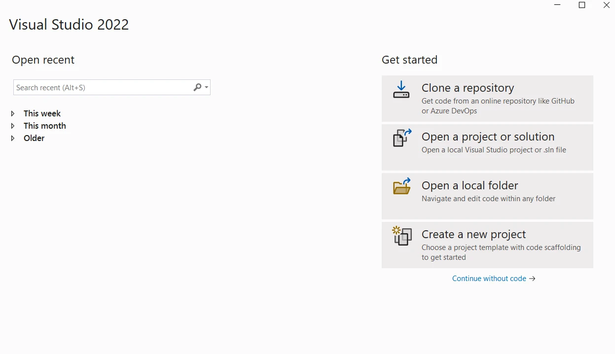 Visual Studio 2022 启动屏幕显示打开最近项目、克隆存储库、打开项目/解决方案、打开本地文件夹或创建新项目的选项。