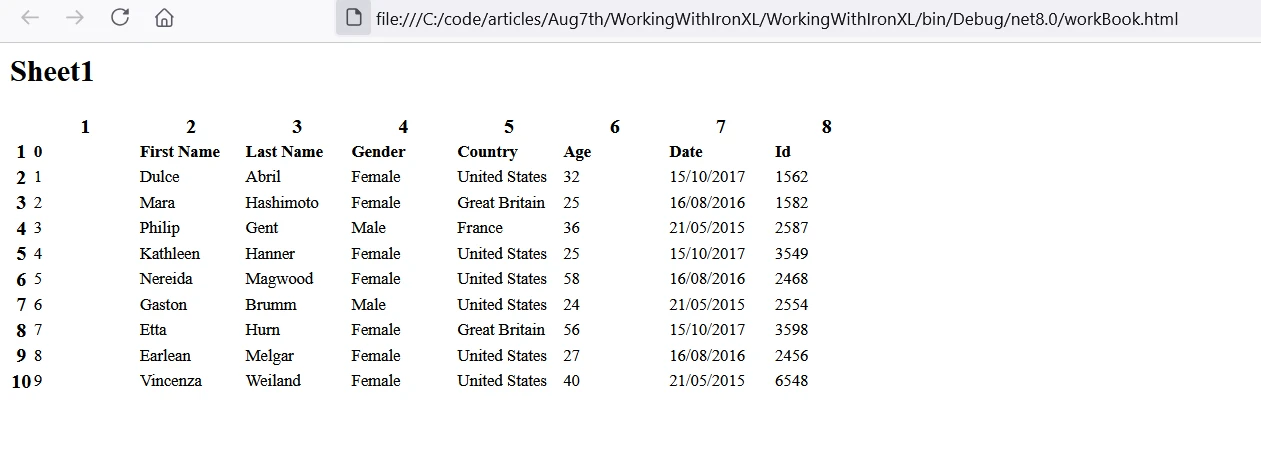 IronXL 提供了 ExportToHtml 方法来将 Excel 文件转换为 HTML。此方法允许自定义选项以确保 HTML 输出符合您的要求。