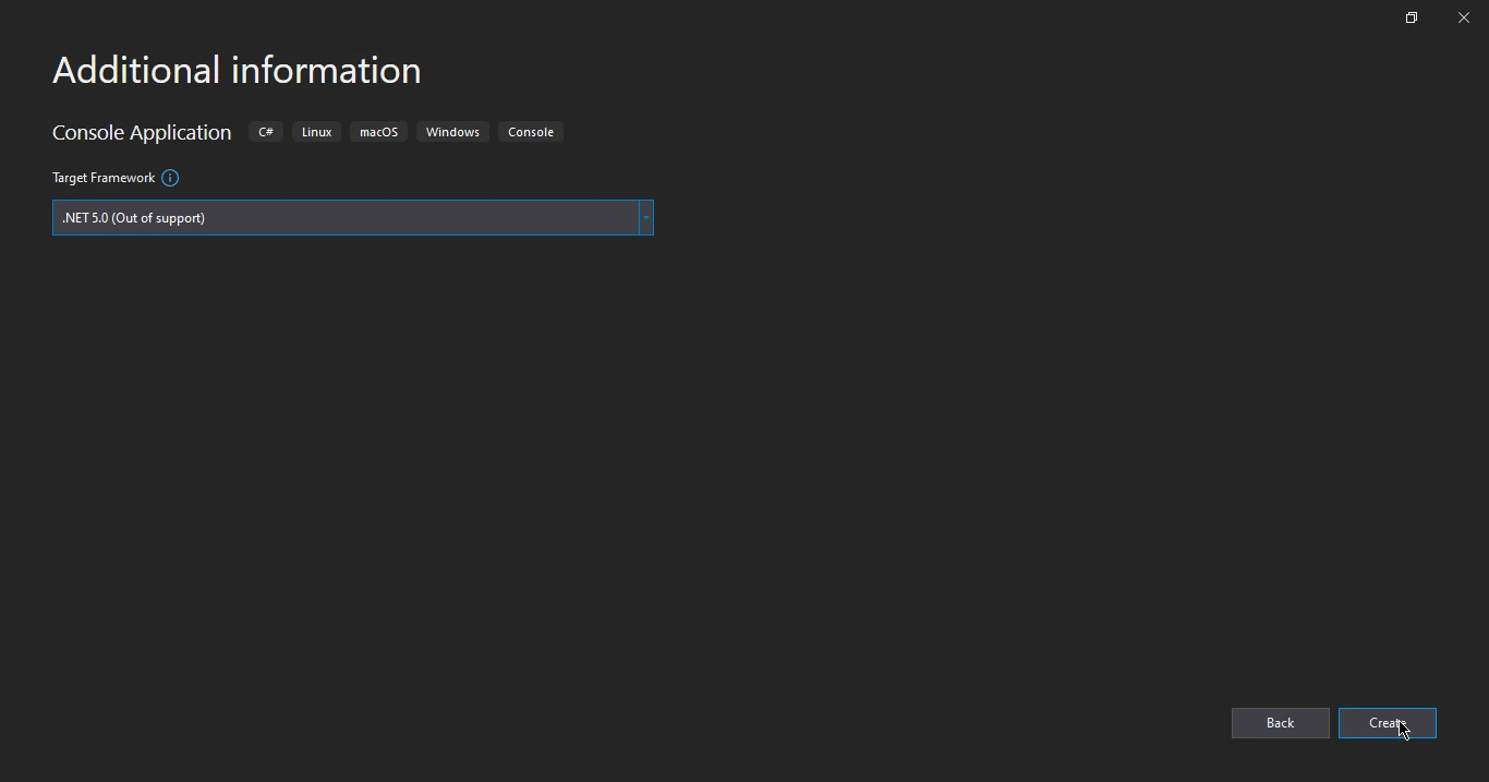 Visual Studio 项目创建对话框显示"其他信息"步骤,其中已选择 .NET 5.0 作为控制台应用程序的目标框架。 图 4:创建新的控制台应用程序项目时,在"其他信息"对话框中选择 .NET 5.0 作为目标框架