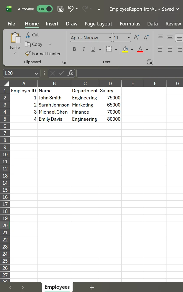 string filePath = @"C:\Reports\EmployeeReport_IronXL.xlsx";