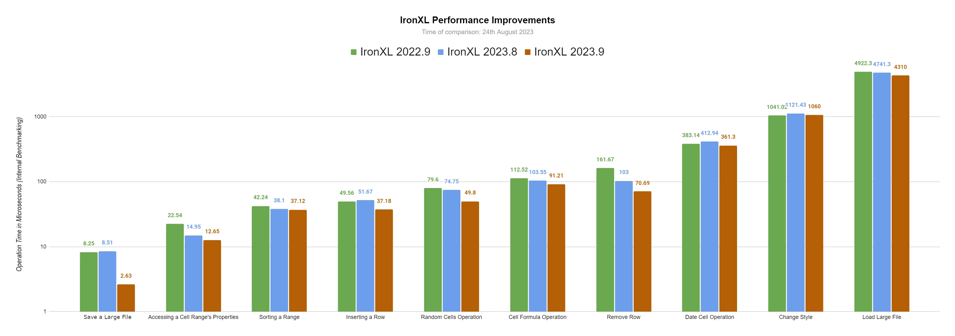 IronXL 里程碑:稳定性和性能 IronXL里程碑:性能和内存大幅提升 Curtis Chau 已更新:2025年6月1日 下载 IronXL NuGet 下载 DLL 下载 免费试用 法学硕士副本 法学硕士副本 将页面复制为 Markdown 格式,用于 LLMs 在 ChatGPT 中打开 向 ChatGPT 咨询此页面 在双子座打开 向 Gemini 询问此页面 在 Grok 中打开 向 Grok 询问此页面 打开困惑 向 Perplexity 询问有关此页面的信息 分享 在 Facebook 上分享 分享到 X(Twitter) 在 LinkedIn 上分享 复制链接 电子邮件文章 This article was translated from English: Does it need improvement? Translated View the article in English *更新*:IronXL 性能改进 主要优势:提高运营速度,实现新的效率。 次要好处:内存分配得到改善。 发货日期**:2023年9月 截至我们最新的 2023 年 9 月版本 (2023.9.29) 发布时,IronXL 的 NuGet 安装量已超过 50 万次,我们回顾了我们的开发团队在过去一年中取得的所有成就和更新,使 IronXL 成为 .NET Excel 文档库市场的领先产品。 "即使在我的低配置电脑上,我也需要更快的 IronXL!" IronXL性能提升 IronXL 在运行速度和内存方面都取得了巨大的进步。 在本节中,我们将把 IronXL 与一年前的 9 月(2022.9)以及上个月的 8 月(2023.8)进行比较。 IronXL 2023.9 版本(最新版)对比 IronXL 2023.8 版本(上个月版)对比 IronXL 2022.9 版本(去年版) 图 0 从下图可以看出,许多指标都在进行比较:根据所有指标,IronXL 与去年同期和上个月相比都有所改进。 竞争对手对比 IronXL 2023.9 版本 图 1 图 2 图 3 图 4 IronXL内存分配改进 IronXL 在运行内存使用方面取得了巨大的进步。 这是一个重要的进步,它确保新版本的 IronXL 将使用更少的内存,从而在不更改代码的情况下节省生产时间和金钱。 在本节中,我们将把 IronXL 与一年前的 9 月(2022.9)以及上个月的 8 月(2023.8)进行比较。 图 5 下图比较了三个指标: 访问单元格区域的属性 同样的操作,内存使用量从 4.41 千字节减少到 3.8 千字节,比上一年提高了 14%! 随机单元格操作 同样的操作,内存使用量从 9.26 千字节减少到约 8.5 千字节,比上一年提高了 8%! 移除大行操作 同样的操作,内存使用量从 65.46 千字节减少到约 20.3 千字节,比上一年提高了 69%! 请注意 Y 轴上的对数刻度,因为这低估了我们将这项操作减少了三分之二的事实。 使用常规的 Y 轴,我们可以看到这 69% 的改进: 图 6 下面我们还比较更大范围的操作: 图 7 下图比较了三个指标: 数据单元操作 同样的操作,内存使用量从 676.81 千字节减少到 669.91 千字节,比上一年提高了 2%! 考虑到每次编辑 Excel 文档时都会出现很多这样的情况,这确实意义重大。 保存大文件 同样的操作,内存使用量从约 1028 兆字节减少到约 838 兆字节,与去年同期和去年同期相比,内存使用量均提高了 18%! IronXL里程碑:性能提升 准备开始了吗? Nuget 下载 1,846,091 | 版本: 2026.2 刚刚发布 免费 NuGet 下载 总下载量:1,846,091 查看许可证