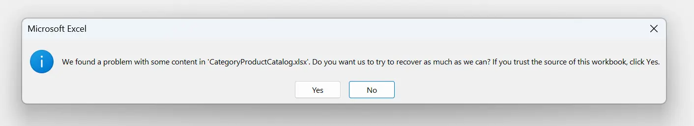 IronXL 故障排除 Excel 限制:字符串列表的数据验证 Excel在字符串数据验证方面的局限性 Curtis Chau 已更新:2025年8月19日 下载 IronXL NuGet 下载 DLL 下载 免费试用 法学硕士副本 法学硕士副本 将页面复制为 Markdown 格式,用于 LLMs 在 ChatGPT 中打开 向 ChatGPT 咨询此页面 在双子座打开 向 Gemini 询问此页面 在 Grok 中打开 向 Grok 询问此页面 打开困惑 向 Perplexity 询问有关此页面的信息 分享 在 Facebook 上分享 分享到 X(Twitter) 在 LinkedIn 上分享 复制链接 电子邮件文章 This article was translated from English: Does it need improvement? Translated View the article in English Microsoft Excel 对字符串列表的长度有一个已知的限制,即列表的总长度(包括逗号等分隔符)不能超过 255 个字符。 当您在源字段中手动输入字符串列表,而不是从 Excel 表格中的现有范围中选择数据时,就会出现此问题,如下所示。 Excel 限制问题 解决 Excel 限制问题 针对此限制的标准解决方法是在工作表的列或行中创建值列表,而不是在源字段中输入字符串列表。 如下所示。 Excel 局限性解决方案示例 之后,在数据验证中使用公式引用,例如 C1:C100,并指向该范围。 这种方法可以绕过限制,让你创建下拉列表而不受 255 个字符的限制。 IronXL 出现问题 IronXL 使用AddStringListRule方法将字符串列表应用于数据验证。 但是,由于上述 Excel 中的字符限制,保存方法仍然有效。 但是,需要注意的是,如果列表超过 255 个字符,则可能会导致严重问题:打开文件时 Excel 崩溃。 下面举个例子来说明这个问题。 using IronXL; using IronXL.DataValidations; // Set your license key here if you have one IronXL.License.LicenseKey = "YOUR-LICENSE-KEY"; var workBook = WorkBook.Create(ExcelFileFormat.XLSX); var sheet = workBook.CreateWorkSheet("Validation Rule Example using"); // Apply rules from row 2 down to row 500 var validationRangeStart = "2"; var validationRangeFinish = "500"; // --- 1. Define All Column Headers --- sheet["A1"].Value = "String List Test"; sheet["B1"].Value = "Formula List Test"; sheet["A1:B1"].Style.Font.Bold = true; // 256 string[] arrayString = new string[] { "SKU-A01-R", "SKU-A02-R", "SKU-A03-R", "SKU-A04-R", "SKU-A05-R", "SKU-B01-G", "SKU-B02-G", "SKU-B03-G", "SKU-B04-G", "SKU-B05-G", "SKU-C01-B", "SKU-C02-B", "SKU-C03-B", "SKU-C04-B", "SKU-C05-B", "SKU-D01-Y", "SKU-D02-Y", "SKU-D03-Y", "SKU-D04-Y", "SKU-D05-Y", "END-001", "END-002", "END-003", "END-004", "END-005", "END-010", "END-001" }; // total char with seperator 257 (230 char + 26 sperator [,] ) // no problem when write to a file var skuValidation = sheet.DataValidations.AddStringListRule(sheet[$"A{validationRangeStart}:A{validationRangeFinish}"].RangeAddress, arrayString); // set error box skuValidation.ShowErrorBox = true; skuValidation.ErrorBoxTitle = "Invalid SKU"; skuValidation.ErrorBoxText = "Please select a SKU from the list."; skuValidation.ErrorAlert = ErrorAlert.Stop; //attempt to save the file var fileName = "CategoryProductCatalog.xlsx"; workBook.SaveAs(fileName); using IronXL; using IronXL.DataValidations; // Set your license key here if you have one IronXL.License.LicenseKey = "YOUR-LICENSE-KEY"; var workBook = WorkBook.Create(ExcelFileFormat.XLSX); var sheet = workBook.CreateWorkSheet("Validation Rule Example using"); // Apply rules from row 2 down to row 500 var validationRangeStart = "2"; var validationRangeFinish = "500"; // --- 1. Define All Column Headers --- sheet["A1"].Value = "String List Test"; sheet["B1"].Value = "Formula List Test"; sheet["A1:B1"].Style.Font.Bold = true; // 256 string[] arrayString = new string[] { "SKU-A01-R", "SKU-A02-R", "SKU-A03-R", "SKU-A04-R", "SKU-A05-R", "SKU-B01-G", "SKU-B02-G", "SKU-B03-G", "SKU-B04-G", "SKU-B05-G", "SKU-C01-B", "SKU-C02-B", "SKU-C03-B", "SKU-C04-B", "SKU-C05-B", "SKU-D01-Y", "SKU-D02-Y", "SKU-D03-Y", "SKU-D04-Y", "SKU-D05-Y", "END-001", "END-002", "END-003", "END-004", "END-005", "END-010", "END-001" }; // total char with seperator 257 (230 char + 26 sperator [,] ) // no problem when write to a file var skuValidation = sheet.DataValidations.AddStringListRule(sheet[$"A{validationRangeStart}:A{validationRangeFinish}"].RangeAddress, arrayString); // set error box skuValidation.ShowErrorBox = true; skuValidation.ErrorBoxTitle = "Invalid SKU"; skuValidation.ErrorBoxText = "Please select a SKU from the list."; skuValidation.ErrorAlert = ErrorAlert.Stop; //attempt to save the file var fileName = "CategoryProductCatalog.xlsx"; workBook.SaveAs(fileName); Imports IronXL Imports IronXL.DataValidations ' Set your license key here if you have one IronXL.License.LicenseKey = "YOUR-LICENSE-KEY" Dim workBook = WorkBook.Create(ExcelFileFormat.XLSX) Dim sheet = workBook.CreateWorkSheet("Validation Rule Example using") ' Apply rules from row 2 down to row 500 Dim validationRangeStart = "2" Dim validationRangeFinish = "500" ' --- 1. Define All Column Headers --- sheet("A1").Value = "String List Test" sheet("B1").Value = "Formula List Test" sheet("A1:B1").Style.Font.Bold = True ' 256 Dim arrayString() As String = { "SKU-A01-R", "SKU-A02-R", "SKU-A03-R", "SKU-A04-R", "SKU-A05-R", "SKU-B01-G", "SKU-B02-G", "SKU-B03-G", "SKU-B04-G", "SKU-B05-G", "SKU-C01-B", "SKU-C02-B", "SKU-C03-B", "SKU-C04-B", "SKU-C05-B", "SKU-D01-Y", "SKU-D02-Y", "SKU-D03-Y", "SKU-D04-Y", "SKU-D05-Y", "END-001", "END-002", "END-003", "END-004", "END-005", "END-010", "END-001" } ' no problem when write to a file Dim skuValidation = sheet.DataValidations.AddStringListRule(sheet($"A{validationRangeStart}:A{validationRangeFinish}").RangeAddress, arrayString) ' set error box skuValidation.ShowErrorBox = True skuValidation.ErrorBoxTitle = "Invalid SKU" skuValidation.ErrorBoxText = "Please select a SKU from the list." skuValidation.ErrorAlert = ErrorAlert.Stop 'attempt to save the file Dim fileName = "CategoryProdu
