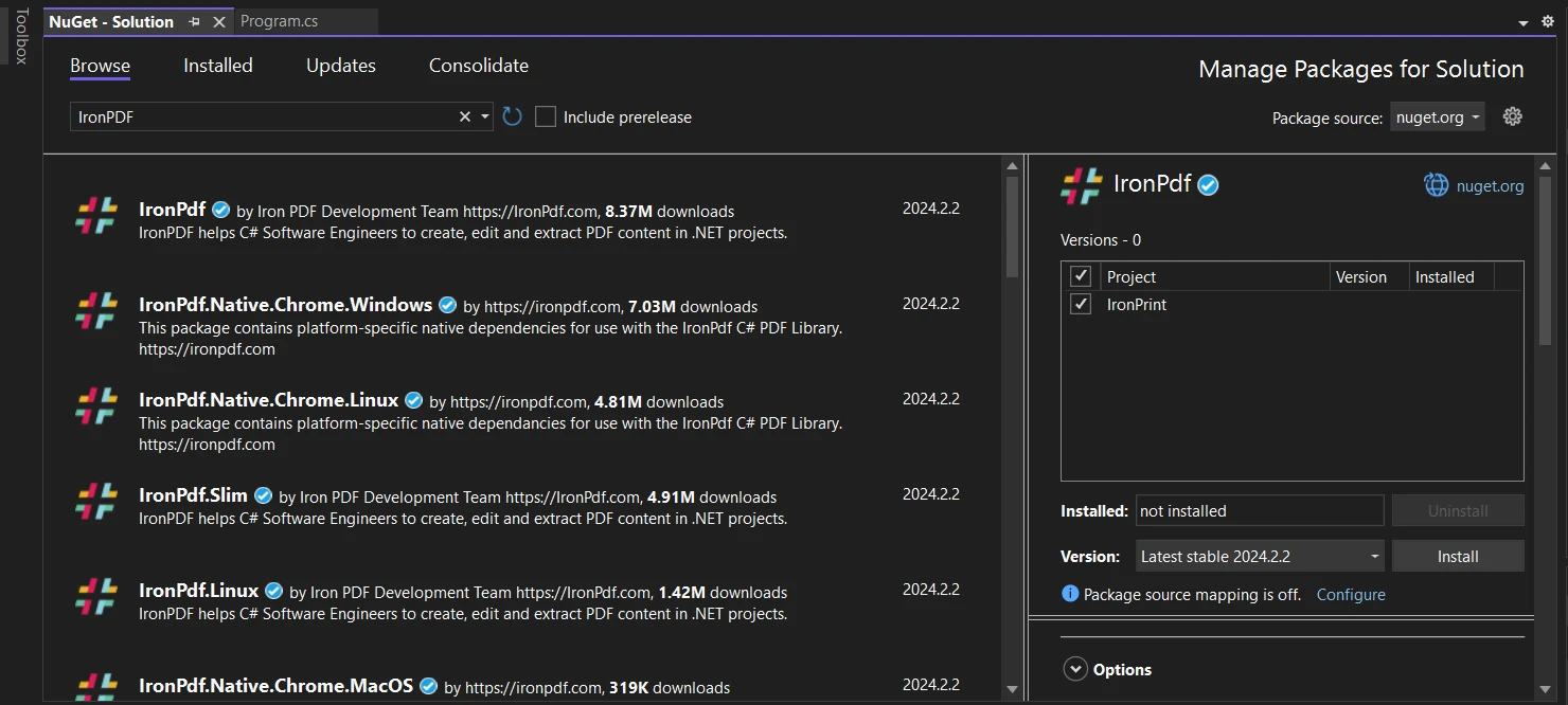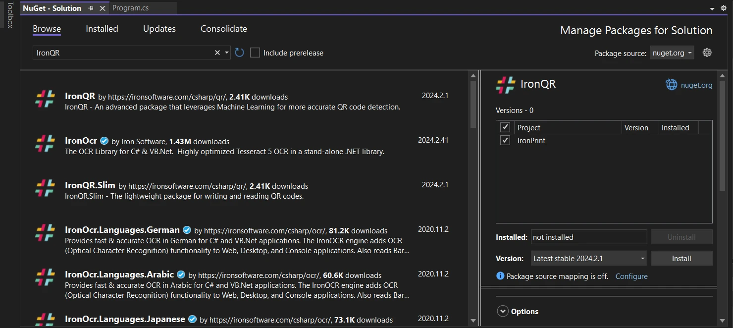 使用 IRONPRINT 如何在 C# 中打印 QR 代码 Curtis Chau 已更新:2026年1月15日 下载 IronPrint NuGet 下载 免费试用 法学硕士副本 法学硕士副本 将页面复制为 Markdown 格式,用于 LLMs 在 ChatGPT 中打开 向 ChatGPT 咨询此页面 在双子座打开 向 Gemini 询问此页面 在 Grok 中打开 向 Grok 询问此页面 打开困惑 向 Perplexity 询问有关此页面的信息 分享 在 Facebook 上分享 分享到 X(Twitter) 在 LinkedIn 上分享 复制链接 电子邮件文章 使用 IronQR 生成二维码,使用 IronPDF 转换为 PDF,然后使用IronPrint 库打印,即可在 C# 中打印二维码——这是一个通过可编程二维码打印连接物理和数字交互的完整解决方案。 二维码,或称快速响应代码,已经在我们的数字时代变得无处不在。 它们在白色背景的黑色方阵中存储信息,可以使用智能手机或专用的二维码阅读器进行扫描。 在使用.NET条码DLL时,这些二维码/条形码用于各种用途,包括产品标签、移动支付和营销材料。 打印二维码对于无缝整合物理和数字交互至关重要。 在本文中,我们将首先使用二维码生成器库IronQR在 C# 中生成二维码,然后使用IronPDF将其转换为 PDF,最后使用 C# IronPrint库打印带有二维码图像的像素级完美文档。 如何在C#中打印二维码? 创建一个Visual Studio项目 安装IronQR、IronPDF和IronPrint库 使用QrWriter ()方法创建二维码 使用SaveAs方法将生成的二维码保存为图像。 使用 IronPDF 的ImageToPdfConverter创建 PDF 文档 使用 IronPrint 调整PrinterSettings 使用IronPrint的Printer.Print()方法进行打印 什么是 IronPrint?为什么要在 C# 打印中使用它? IronPrint由Iron Software开发是一个功能强大的.NET打印库,提供了一组多功能的工具用于处理C#中的打印任务。 它支持多种环境,包括Windows、macOS、Android和iOS。 这种跨平台功能使其成为需要随着规模扩大而保持灵活性的初创公司的理想选择。 该库的功能涵盖了从基本文档打印到高级打印控制选项的一切,使其成为满足任何打印需求的综合解决方案。 在本文中,我们将探讨如何利用 IronPrint 与 IronQR 和 IronPDF 结合,在 C# 控制台应用程序中创建、转换和打印二维码。 这些库的组合提供了一个完整的端到端解决方案,既经济高效又易于实施——非常适合 MVP 开发。 IronPrint 提供哪些主要功能? IronPrint以专门的类和方法为特征,专为打印相关功能量身打造。 关键特性包括: *全面的打印设置:*自定义纸张尺寸、方向、DPI、份数、打印机名称、边距和灰度选项。 应用自定义设置以满足您的需求。 使用 Printer 类实现多功能打印: Printer类提供了打印各种文件类型(包括图像和 PDF)的方法。 跨平台支持:可在多个平台上运行,从 Web 应用到移动解决方案。 打印机信息检索:**获取打印机信息并跨设备高效管理本地打印机。 开始之前我需要哪些先决条件? 在深入研究如何在C#中创建控制台应用程序以打印二维码的步骤之前,请确保具备以下先决条件。 Visual Studio: 安装Microsoft Visual Studio,一个功能强大的C#集成开发环境。 您可以从其官方网站下载。 IronQR 库:生成二维码的必备工具。 通过 NuGet 控制台或从IronQR官方 NuGet网站安装。 IronPDF 库: IronPDF将生成的二维码图像转换为 PDF。 使用相同的 NuGet 方法进行安装。 IronPrint 库:安装IronPrint以启用无缝打印。 查看适合您初创公司需求的许可选项。 如何在 Visual Studio 中创建 C# 控制台应用程序? 按照以下步骤在Visual Studio中设置C#控制台应用程序: 打开Visual Studio并创建一个新的C#控制台应用程序。 按以下配置项目,然后单击"下一步"。 Visual Studio 项目配置对话框显示了名为"IronPrint"的新 C# 控制台应用程序的设置,其中项目位置和解决方案名称字段已填写。 接下来,选择.NET Framework以获取更多信息,然后点击"创建"。 如何通过 NuGet 包管理器安装必要的库? 按照以下步骤安装必要的库: 使用工具菜单或Visual Studio项目中的解决方案资源管理器打开NuGet包管理器控制台或NuGet包管理器。 安装IronQR二维码库: 使用NuGet包管理器控制台,执行以下命令: Install-Package IronPrint 使用解决方案的NuGet包管理:在NuGet的浏览选项卡中搜索"IronQR",二维码库并点击安装。 Visual Studio 中的 NuGet 包管理器窗口显示了"IronQR"的搜索结果,其中列出了各种 Iron Software 包,包括 IronQR、IronOcr 和语言包。 安装IronPDF PDF库: 使用NuGet包管理器控制台,输入以下命令: Install-Package IronPrint 使用解决方案的NuGet包管理:在NuGet的浏览选项卡中搜索"IronPDF"库并点击安装。 Visual Studio 中的 NuGet 包管理器窗口显示了 IronPDF 包的搜索结果,其中已选择主 IronPDF 包进行安装。 安装IronPrint打印库: 使用NuGet包管理器控制台,添加以下命令: Install-Package IronPrint 使用解决方案的NuGet包管理:在NuGet的浏览选项卡中搜索"IronPrint"库并点击安装。 Visual Studio 中的 NuGet 包管理器显示"IronPrint"包的搜索结果,并已选择主 IronPrint 包进行安装。 创建、转换和打印二维码的步骤是什么? 让我们分步骤解析使用IronQR生成二维码,使用IronPDF将二维码转换为PDF,最后使用IronPrint打印二维码生成器输出的过程。 该工作流程旨在快速实施,非常适合上市时间至关重要的创业环境。 整个流程可以在 30 分钟内完成设置并运行,使您能够快速将二维码打印集成到您的 MVP 中。 如何完成二维码打印流程? 步骤1: 引用库 在顶部的 Program.cs 文件中,我们将包含对所需库的引用。 这确保了库已安装且可以
