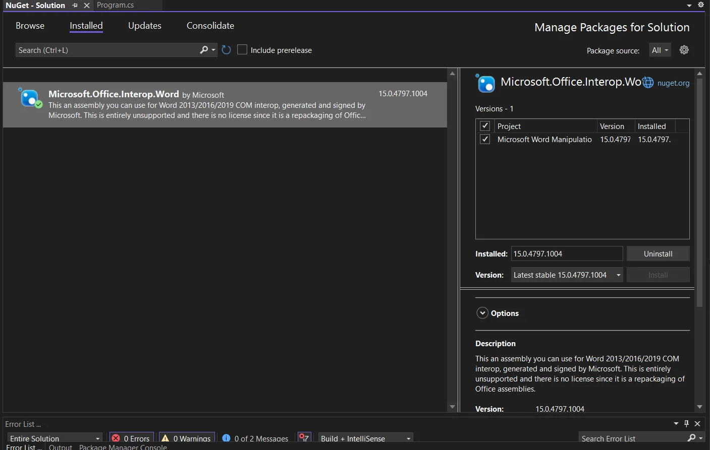 使用 IRONWORD C# 打印 Word 教程:分步指南 Jordi Bardia 已更新:六月 22, 2025 下载 IronWord NuGet 下载 免费试用 法学硕士副本 法学硕士副本 将页面复制为 Markdown 格式,用于 LLMs 在 ChatGPT 中打开 向 ChatGPT 咨询此页面 在双子座打开 向 Gemini 询问此页面 在双子座打开 向 Gemini 询问此页面 打开困惑 向 Perplexity 询问有关此页面的信息 分享 在 Facebook 上分享 分享到 X(Twitter) 在 LinkedIn 上分享 复制链接 电子邮件文章 欢迎来到本教程,我们将探讨如何在 C# 控制台应用程序中使用 Microsoft Interop 打印 Word 文档。 本入门指南将引导您完成通过编程方式打印 Microsoft Word 文档的步骤。 前提条件 在深入研究代码之前,必须先做好以下几项准备工作: Microsoft Word 安装:请确保您的系统上已安装 Microsoft Word。 如果还没有安装,请前往您电脑的微软官方网站或应用商店进行安装。 Visual Studio 安装:您应该已安装 Visual Studio,并具备创建控制台应用程序的功能。 如果您是初学者,可以考虑下载Visual Studio Community ,它是免费的,足以满足我们的需求。 Word 文档:请在您的计算机上准备好一个 Word 文档样本,以便进行测试。 我们将把这份文件发送给印刷厂。 设置环境 创建一个新的控制台应用程序 打开 Visual Studio。 点击"创建新项目"。 搜索"控制台应用程序",然后选择合适的 C# 模板。 给你的项目命名(例如,"InteropPrintConsoleTutorial"),并选择一个合适的位置。 添加互操作性引用 使用 Interop 需要引用 Microsoft Office Interop 库。 添加方法如下: 在 Visual Studio 中,右键单击解决方案资源管理器中的控制台项目。 导航至"添加">"引用"。 在引用管理器窗口中,转到 COM 选项卡。 在搜索栏中输入"Microsoft Word"以筛选列表。 从结果中,选择"Microsoft Word xx.x 对象库"(其中 xx.x 表示版本号)。 点击"确定"按钮添加参考文献。 您也可以使用 NuGet 包管理器进行安装。 您还可以使用 NuGet 包管理器安装Microsoft.Office.Interop.Word库。 验证应用程序设置 请确保您的应用程序的目标框架与互操作库兼容。 您可以通过在解决方案资源管理器中右键单击项目,选择"属性",然后在"应用程序"选项卡下查看"目标框架"来检查这一点。 如果遇到 Interop 库版本问题,请考虑下载必要的软件包或程序集,或者调整目标框架版本。 环境设置完毕,现在可以开始编码过程了。 了解文档对象 在处理 Word 文档时,文档对象是 Interop 服务的核心。 该对象代表一个 Microsoft Word 文档,并提供其所有功能。 常见任务之一是打开文档: using Word = Microsoft.Office.Interop.Word; // Object needed to avoid passing specific parameters object oMissing = Type.Missing; // File path to the Word document you want to open object fileName = @"C:\path_to_document\document.docx"; // Create a new instance of the Word application Word.Application wordApp = new Word.Application(); // Open the document with specified parameters Word._Document wordDoc = wordApp.Documents.Open( ref fileName, ref oMissing, ref oMissing, ref oMissing, ref oMissing, ref oMissing, ref oMissing, ref oMissing, ref oMissing, ref oMissing, ref oMissing, ref oMissing, ref oMissing, ref oMissing, ref oMissing, ref oMissing); using Word = Microsoft.Office.Interop.Word; // Object needed to avoid passing specific parameters object oMissing = Type.Missing; // File path to the Word document you want to open object fileName = @"C:\path_to_document\document.docx"; // Create a new instance of the Word application Word.Application wordApp = new Word.Application(); // Open the document with specified parameters Word._Document wordDoc = wordApp.Documents.Open( ref fileName, ref oMissing, ref oMissing, ref oMissing, ref oMissing, ref oMissing, ref oMissing, ref oMissing, ref oMissing, ref oMissing, ref oMissing, ref oMissing, ref oMissing, ref oMissing, ref oMissing, ref oMissing); Imports Word = Microsoft.Office.Interop.Word ' Object needed to avoid passing specific parameters Private oMissing As Object = Type.Missing ' File path to the Word document you want to open Private fileName As Object = "C:\path_to_document\document.docx" ' Create a new instance of the Word application Private wordApp As New Word.Application() ' Open the document with specified parameters Private wordDoc As Word._Document = wordApp.Documents.Open(fileName, oMissing, oMissing, oMissing, oMissing, oMissing, oMissing, oMissing, oMissing, oMissing, oMissing, oMissing, oMissing, oMissing, oMissing, oMissing) $vbLabelText $csharpLabel 带有ref oMissing多个参数可能看起来很吓人,但对于 Open 方法来说至关重要,因为 Open 方法需要许多参数,其中大多数是可选的。 实现打印功能 环境设置完毕,也了解了文档对象,现在是时候深入了解打印 Word 文档的核心功能了。 Word文档的基本打印功能 要打印此文档,您可以使用以下方法: // Method to print the document using default printer settings private void ButtonPrint_Click(object sender, EventArgs e) { wordDoc.PrintOut(); // Sends the document to the default printer } // Method to print the document using default printer settings private void ButtonPrint_Click(object sender, EventArgs e) { wordDoc.PrintOut(); // Sends the document to the default printer } ' Method to print the document using default printer settings Private Sub ButtonPrint_Click(ByVal sender As Object, ByVal e As EventArgs) wordDoc.PrintOut() ' Sends the document to the default printer End Sub $vbLabelText $csharpLabel 此方法使用默认设置将文档发送到默认打印机。 打印自定义 Word 文档 如果要添加打印对话框、自定义打印机设置,甚至打印多页,则需要更详细的方法: // Method to print the document with custom settings pr