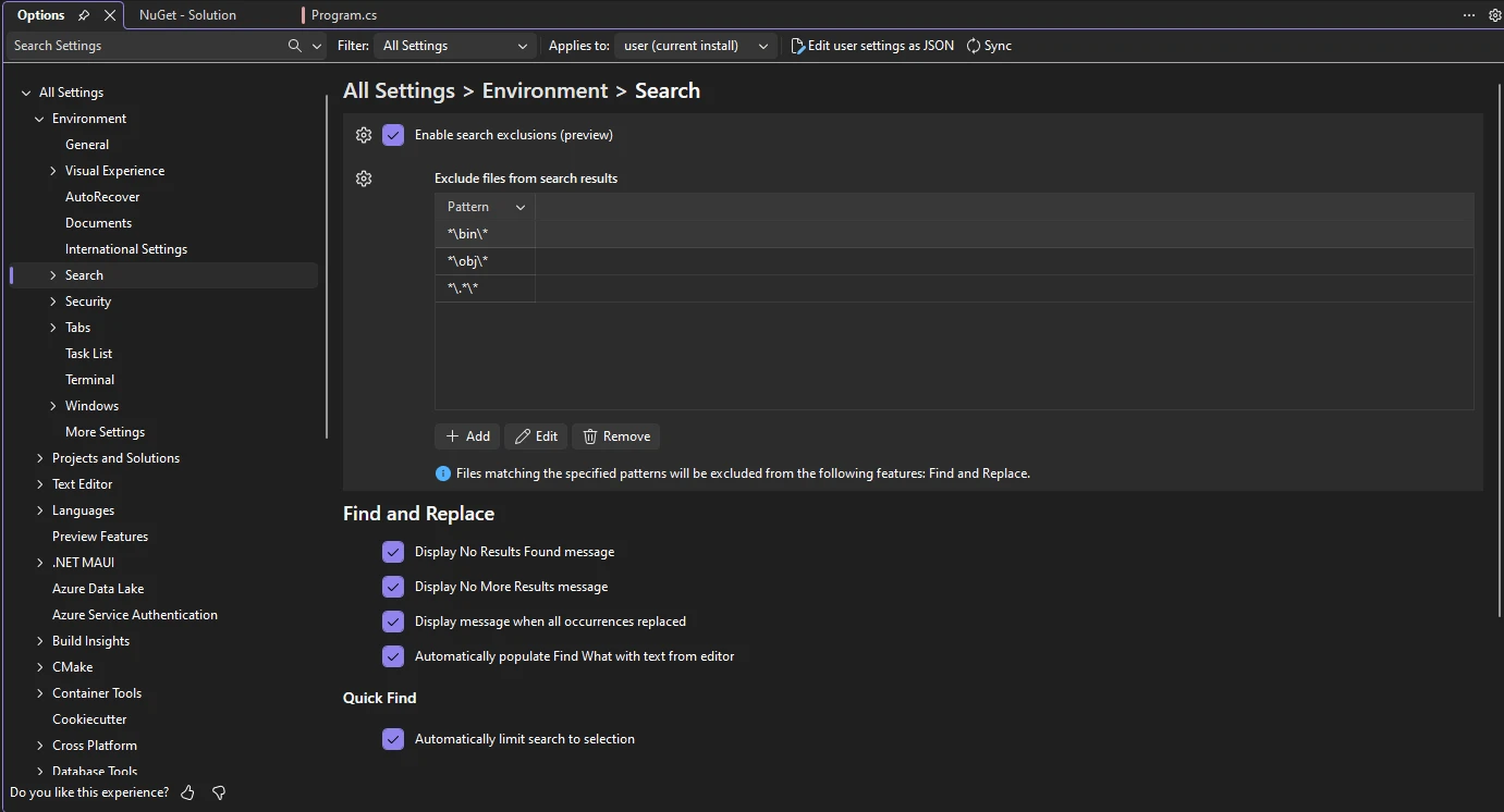 现代设置体验用简洁、用户友好的界面取代了传统的"工具">"选项"对话框。 重新设计的用户体验使 .NET 开发人员能够更轻松地快速配置其开发环境,无论他们是在开发 Web 应用程序、命令行界面工具还是企业版项目。