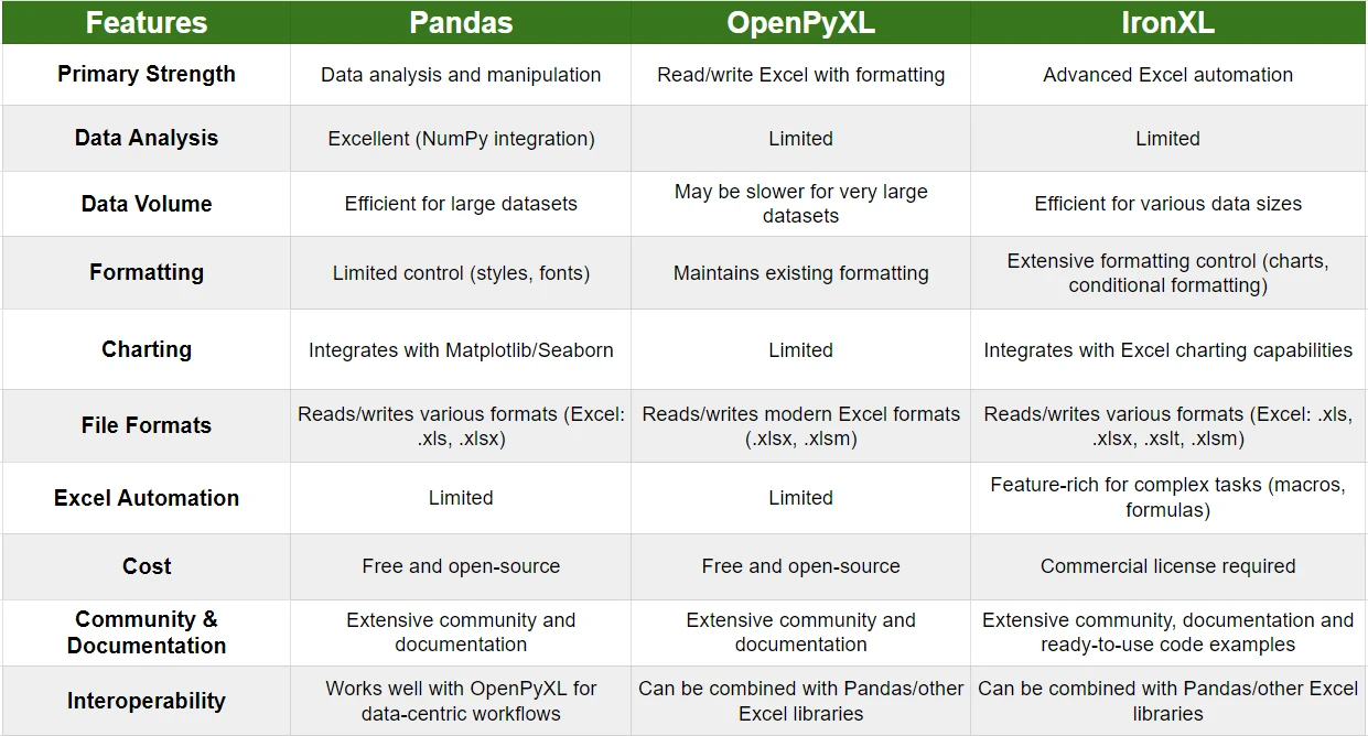 与其他组件比较 最佳 Excel Python 库(开发者列表) Curtis Chau 已更新:六月 22, 2025 下载 IronXL pip 下载 免费试用 法学硕士副本 法学硕士副本 将页面复制为 Markdown 格式,用于 LLMs 在 ChatGPT 中打开 向 ChatGPT 咨询此页面 在双子座打开 向 Gemini 询问此页面 在双子座打开 向 Gemini 询问此页面 打开困惑 向 Perplexity 询问有关此页面的信息 分享 在 Facebook 上分享 分享到 X(Twitter) 在 LinkedIn 上分享 复制链接 电子邮件文章 在 Python 编程的多样化环境中,操作数据并将其写入 Microsoft Excel 文件是数据分析、报告和自动化任务的常见需求。 由于有多个Python 包可供使用,包括Pandas 、 OpenPyXL和IronXL ,因此选择合适的库来完成任务可能会让人感到不知所措。 在本综合指南中,我们将探讨上述 Python 包的优势、劣势和关键考虑因素,以帮助您根据自身具体需求做出明智的决定。 1. Pandas:数据分析的强大工具 Pandas被广泛认为是 Python 中用于数据操作和分析的首选开源 Python 库之一。 它提供了强大的数据结构,如 DataFrames 和 Series,以及大量的数据清洗、转换和可视化函数。 最佳 Excel Python 库(开发者列表):图 1 - Pandas 优势 Pandas 的以下特性使其成为一个强大的库: 出色的分析、数据处理和可视化能力。 能够高效处理大型数据集,并优化性能。 与 NumPy 无缝集成,用于数值计算和统计分析。 读取和写入各种文件格式,包括 Microsoft Excel 文件 (.XLSX)。 非常适合用于清洗、转换和准备数据,以便进行进一步分析。 弱点 对 Excel 格式(字体、样式、图表)的控制有限。 不适用于复杂的电子表格交互或超出基本数据操作的自动化任务。 2. OpenPyXL:多功能读写冠军 OpenPyXL是一个专门用于读写 Excel 文件的 Python 库。 它在保持数据完整性和格式方面表现出色,同时提供了用于创建和操作 Excel 文件的广泛 API。 OpenPyXL 具有积极的维护功能,并专注于 Excel 文件结构,因此对于涉及复杂 Excel 文件操作的项目来说,它是一个可靠的选择。 最佳 Excel Python 库(开发者列表):图 2 - OpenPyXL - 读取 Excel 文件 优势 以下是OpenPyXL的一些关键特性,使其在众多同类产品中脱颖而出: 轻松读取和写入现代 Excel 文件(.XLSX、.XLSM、.XLTX、.XLTM)。 维护数据完整性和格式,包括条件格式和图表。 提供强大的 API,用于创建新的 Excel 文件、操作现有文件以及执行高级操作。 弱点 与 Pandas 相比,它对数据分析的重视程度较低,Pandas 更侧重于读/写操作。 对于非常大的数据集,速度可能会比较慢,尤其是与 Pandas 等专业数据分析库相比。 3. IronXL:终极 Python Excel 库 IronXL是一个功能强大且特性丰富的 Python 库,专为 Excel 自动化任务而设计。 IronXL 拥有全面的功能集,使开发人员能够在 Python 项目中无缝地创建、读取、写入、修改和格式化 Excel 文件。 IronXL 的独特之处在于它专注于高级 Excel 自动化,为宏、公式和复杂的格式控制等复杂任务提供支持。 最佳 Excel Python 库(开发者列表):图 3 - IronXL 它直观的 API 和类似 Excel 的对象模型使其易于集成和使用,而其跨平台兼容性则确保了在各种操作系统和云平台上的灵活性。 无论是生成详细报告、执行数据分析,还是构建复杂的基于 Excel 的工作流程,IronXL 都能提供高效简化 Excel 相关任务所需的工具和功能。 以下简单的 Python 代码演示了如何轻松地将 IronXL 集成到 Python 项目中,并使用它读取 Excel 文件: from ironxl import * # Load existing Excel file (workbook) workbook = WorkBook.Load("sample.xlsx") # Select worksheet at index 0 worksheet = workbook.WorkSheets[0] # Get any existing worksheet first_sheet = workbook.DefaultWorkSheet # Select a cell and return the converted value cell_value = worksheet["A2"].IntValue # Read from a range of cells elegantly for cell in worksheet["A2:A10"]: print("Cell {} has value '{}'".format(cell.AddressString, cell.Text)) # Calculate aggregate values such as Sum total_sum = worksheet["A2:A10"].Sum() from ironxl import * # Load existing Excel file (workbook) workbook = WorkBook.Load("sample.xlsx") # Select worksheet at index 0 worksheet = workbook.WorkSheets[0] # Get any existing worksheet first_sheet = workbook.DefaultWorkSheet # Select a cell and return the converted value cell_value = worksheet["A2"].IntValue # Read from a range of cells elegantly for cell in worksheet["A2:A10"]: print("Cell {} has value '{}'".format(cell.AddressString, cell.Text)) # Calculate aggregate values such as Sum total_sum = worksheet["A2:A10"].Sum() PYTHON 如需了解更多 Excel 操作,例如创建和写入 Excel 文件、筛选现有 Excel 文件以及将其他格式的文件转换为 XLSX 文件,请访问代码示例页面上的现成 Python 脚本。 优势 以下是IronXL的一些主要优势: 功能丰富,可执行高级 Excel 自动化任务,适用于复杂的工作流程。 支持各种 Excel 交互,包括宏、公式和图表等数据写入。 轻松处理复杂的格式设置和图表创建。 提供类似 Excel 的对象模型,方便用户直观使用和无缝集成。 弱点 使用需要商业许可,这可能不适合开源项目或预算限制。 与 Pandas 和 OpenPyXL 等免费开源替代方案相比,社区支持有限。 选择的关键考虑因素 主要任务:确定您的主要任务——数据分析(Pandas)、带格式化的读/写操作(OpenPyXL)或深度 Excel 自动化(IronXL)。 数据量:考虑数据集的大小——Pandas 在处理海量数据集方面表现出色,而 OpenPyXL 和 IronXL 可能提供更好的文件大小管理。 格式要求:如果精细的格式控制至关重要,请优先选择 OpenPyXL 和 IronXL 而不是 Pandas。 成本: Pandas 和 OpenPyX