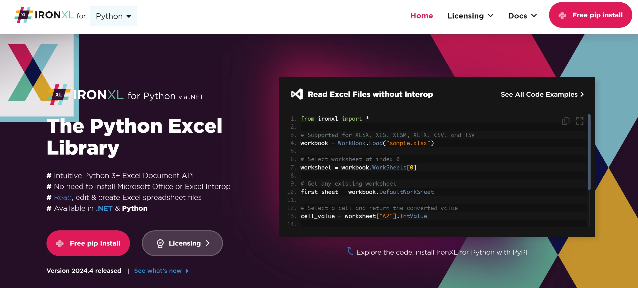 使用 IRONXL FOR PYTHON 如何使用 Python 导出到 Excel 文件 Curtis Chau 已更新:六月 22, 2025 下载 IronXL pip 下载 免费试用 法学硕士副本 法学硕士副本 将页面复制为 Markdown 格式,用于 LLMs 在 ChatGPT 中打开 向 ChatGPT 咨询此页面 在双子座打开 向 Gemini 询问此页面 在双子座打开 向 Gemini 询问此页面 打开困惑 向 Perplexity 询问有关此页面的信息 分享 在 Facebook 上分享 分享到 X(Twitter) 在 LinkedIn 上分享 复制链接 电子邮件文章 在当今数据驱动的环境中,将数据导出到 Excel 电子表格的能力对于许多应用程序和企业来说至关重要。 由于其熟悉性和适应性,Excel 文件仍然是制作报告、进行分析以及与利益相关者沟通调查结果的首选格式。 由于 Python 拥有庞大的库生态系统,开发人员可以使用强大的工具来处理 Excel 文件。 IronXL是一个可靠的选择,可以轻松地将数据导出到 Excel 电子表格,它在众多同类产品中脱颖而出。 在本文中,我们将研究 IronXL for Python 如何使数据导出到工作表变得更容易,从而使开发人员可以更好地控制他们的数据导出过程的组织。 如何使用 Python 导出到 Excel 文件 在 Visual Studio Code 中创建一个 Python 文件。 安装 Pip Python IronXL 库。 确定需要导出到 Excel 的数据。 使用 Excel 库将数据映射到特定单元格。 要将所有数据框导出到新的 Excel 文件,请保存该文件。 IronXL 如何使用 Python 导出到 Excel 文件:图 1 - IronXL 网页 IronXL是一个功能丰富的 Python 库,专为处理 Excel 文件而设计。 程序员可以使用大量的解决方案来读取、写入、编辑和修改电子表格数据。 IronXL 构建于 .NET 框架之上,结合了 Python 的灵活性和 .NET 的性能,提供了一种与 Excel 文件进行交互的高效方式。 IronXL 的主要优势之一是能够轻松地从现有的 Excel 文件中读取数据。 开发人员可以快速从特定文件中提取数据,例如格式化的单元格、行、列名列表以及跟随值或列的对象单元格,从而轻松地将 Excel 电子表格数据合并到 Python 程序中。 无论您需要检索销售、客户还是财务数据,IronXL 都能提供您有效处理 Excel 文件数据所需的工具。 IronXL的特点 借助 IronXL,可以轻松地从现有的 Excel 文件中读取数据,并将其写入新建或预先存在的电子表格中。 这包括多种功能,例如单元格值访问、格式设置和公式。 主要功能示例 *跨平台兼容性:*由于 IronXL 旨在在包括 Windows、Linux 和 macOS 在内的各种平台上流畅运行,因此无论 Python 开发人员使用何种操作系统,它都是一个多功能的选择。 高效性能: IronXL 基于 .NET 框架,能够高效地处理和操作 Excel 文件,即使处理大型数据集也是如此。 它通过将 Python 的灵活性与 .NET 的效率相结合来实现这一点。 支持 Excel 格式: IronXL 可以打开和操作各种 Excel 文件格式,包括:.xls(Excel 97–2003)、.xlsx(Excel 2007 及更高版本)、逗号分隔值文件 (CSV) 和 .xlsm(启用宏的 Excel)。 高级数据处理: IronXL 使用户能够在 Excel 电子表格中执行更复杂的数据处理操作,例如排序、筛选和聚合,这有助于获得有价值的见解。 单元格格式设置: IronXL 的单元格格式设置工具(包括字体样式、颜色、边框和对齐方式)可以提高 Excel 电子表格的视觉吸引力和可读性。 公式计算:用户可以使用 IronXL 在 Excel 电子表格中执行动态计算,以及公式评估和公式引用更新。 与 Python 环境集成:用户可以轻松地将 IronXL 与其他 Python 框架和软件包集成,通过结合 IronXL 的功能来执行全面的数据可视化和分析。 易用性:** IronXL 简单易用的 API 使其适合所有专业水平的 Python 开发人员。 它拥有完善的文档界面,提供了如何充分利用其所有功能的详细说明。 从本质上讲,IronXL 通过提供一种可靠且直观的方法将 Excel 功能集成到 Python 应用程序中,帮助 Python 开发人员克服与管理 Excel 文件相关的挑战。 IronXL 提供了在 Python 生态系统中成功操作 Excel 文件所需的灵活性和工具,无论您是创建交互式仪表板、自动化报告任务,还是开发需要读取 Excel 文件的数据分析工具。 点击这里了解更多关于 IronXL for Python 库的信息。 设置环境 前提条件 在开始本指南之前,请确认您的计算机上已安装以下软件: .NET 6.0 SDK: IronXL 需要您的计算机上安装 .NET 6.0 SDK,因为它是使用该 SDK 构建的。 Python 3.0+:您必须安装 Python 3.0 或更高版本才能学习本教程。 pip:由于 IronXL 需要 Python 包安装程序 pip,请先安装它。 安装 IronXL 在 Visual Studio Code 中打开此文件后,创建一个名为ExportData.py的 Python 文件。 本文件中包含了使用 IronXL 导出 Excel 文件的脚本。 如何使用 Python 导出到 Excel 文件:图 2 - 创建一个新的 Python 文件 在 Visual Studio Code 中,从菜单中选择"终端">"新建终端"以打开命令行。 如何使用 Python 导出到 Excel 文件:图 3 - 终端的打开位置 使用 IronXL 之前,首先要做的是安装库。 您可以使用 Python 的包管理器 pip 运行以下命令快速安装 IronXL: pip install ironxl pip install ironxl SHELL 现在可以使用 IronXL 读取您已安装的 Excel 电子表格文件。 如何使用 Python 导出到 Excel 文件:图 4 - 安装输出到控制台 使用 IronXL 将数据导出到 Excel 使用 IronXL for Python,无需导入 Pandas 即可轻松将数据导出到新的或现有的 Excel 文件。 让我们来看一个简单的例子,说明如何将数据导出到 Excel 表格: from ironxl import WorkBook # Sample dataset created as a list of lists data = [ ["Name", "Age", "Salary"], ["John", 30, 50000], ["Alice", 